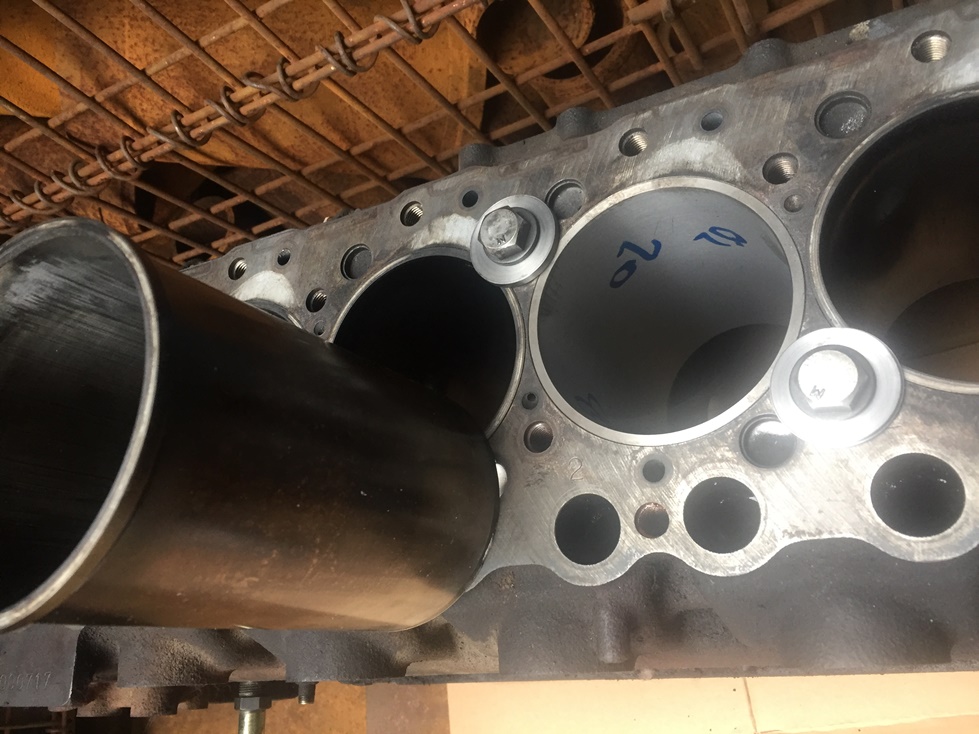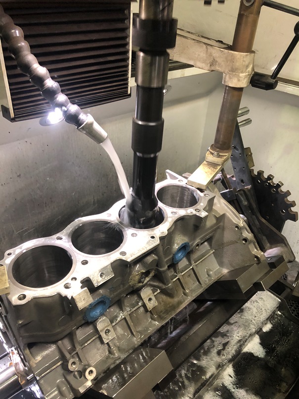 お客さんこだわりの、ストレートスリーブからツバ付スリーブへ変更後のV8 ホーニング粗取り中